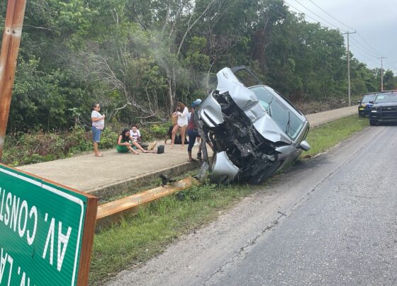 Playa del Carmen.- Una camioneta, con cinco personas a bordo, chocó contra un poste de señalización, luego de ser sacado…